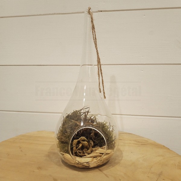 Goutte en verre à végétaliser d’un diamètre de 10cm et d’une hauteur de 23cm pouvant être suspendue ou posée sur un meuble. Cette goutte creuse en verre à suspendre possède une entrée d’un diamètre de 5cm afin d’y placer une plante ou tout autre objet décoratif.