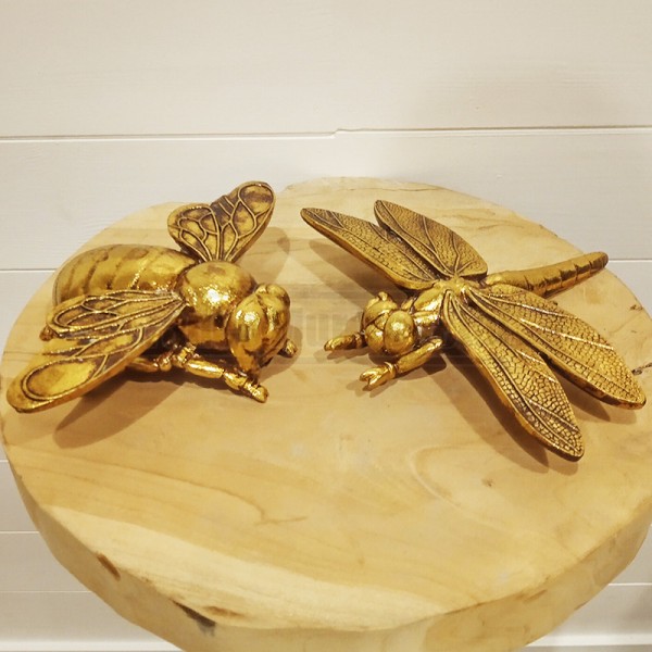 Lot de 2 insectes volants dorés en résine à poser ou accrocher. Ces deux statuettes peuvent être posées sur un meuble, un piédestal, une sellette ou accrochées au mur. Idéal pour décorer votre maison ou lieu professionnel (bureau, bar, café, hôtel ou restaurant).