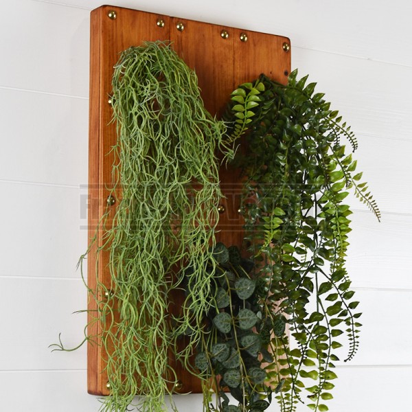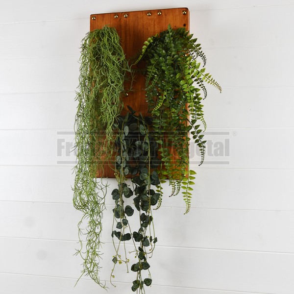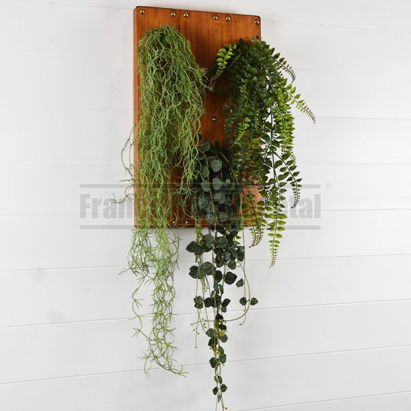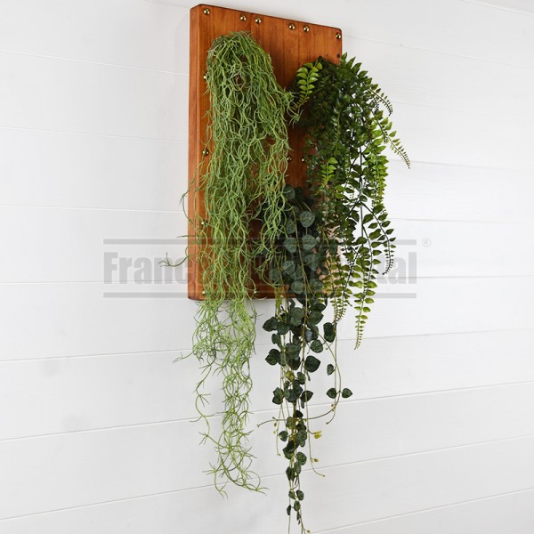 Tableau végétal artificiel format 48x29cm avec trois chutes de tillandsia, ceropegia et fougères fixées sur des planches de bois teintées en merisier foncé et vernis. Idéal pour végétaliser les murs de votre maison, appartement ou lieu de travail (bureau, salle de réunion, hall d’accueil, restaurant…). Plantes artificielles haut de gamme sans entretien.