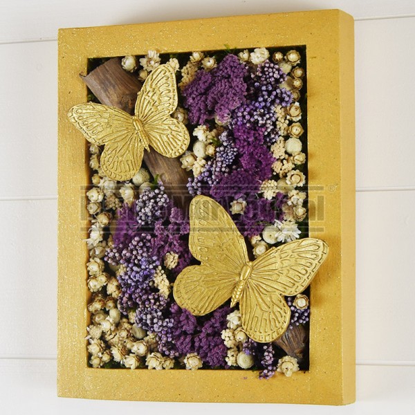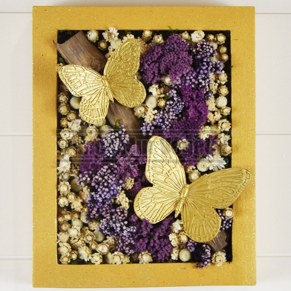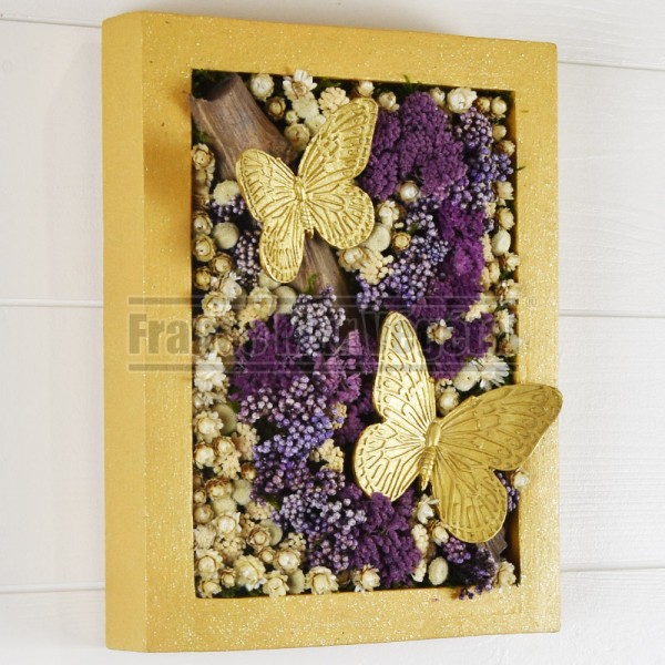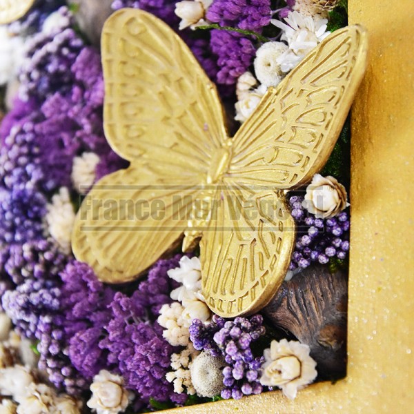 Tableau végétal stabilisé format 25x20cm avec au centre du cadre une branche effet wengé or sur laquelle repose deux papillons dorés, le fond du tableau est en mousse stabilisée avec un mix de fleurs violette et blanche, l’encadrement est peint en couleur or. Idéal pour végétaliser les murs de votre maison, appartement ou lieu de travail. Plantes stabilisées 100% naturelles et sans entretien !