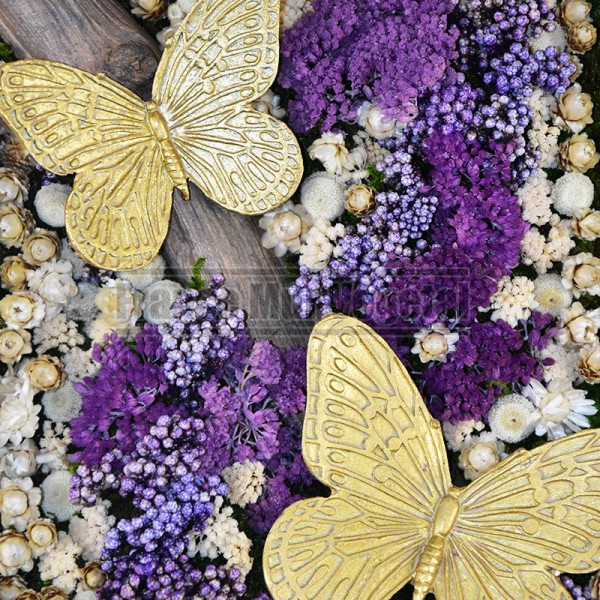 Tableau végétal stabilisé 25x20cm 2 papillons dorés sur branche & fleurs
