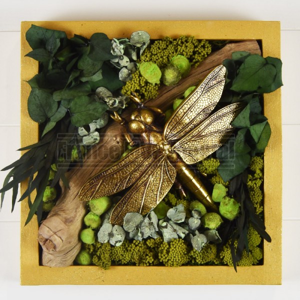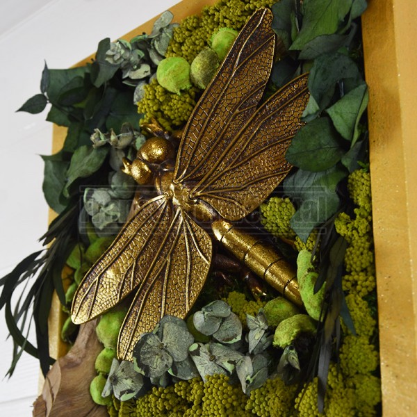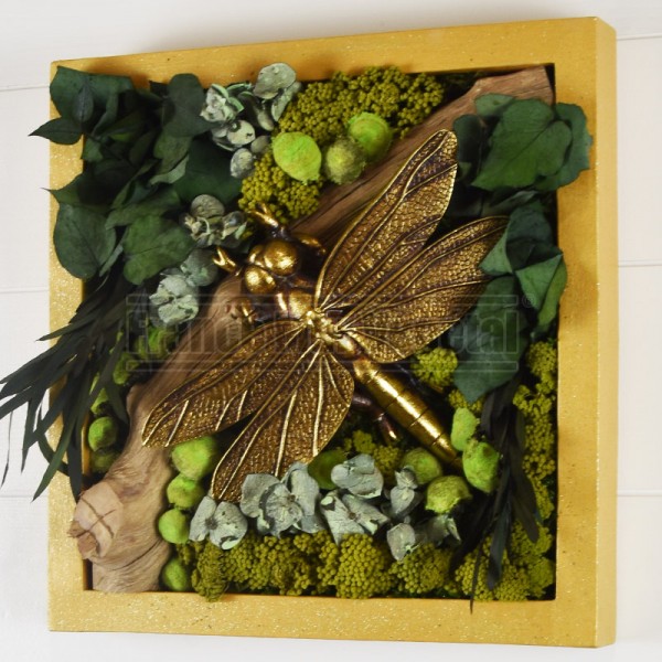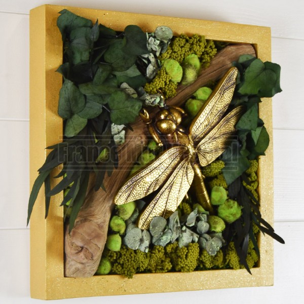 Tableau végétal stabilisé format 30x30cm avec au centre du cadre une branche sur laquelle repose une Libellule dorée, le fond du tableau est en mousse stabilisée avec des feuillages d’eucalyptus et des fleurs, l’encadrement est peint en couleur or. Idéal pour végétaliser les murs de votre maison, appartement ou lieu de travail. Plantes stabilisées 100% naturelles et sans entretien !